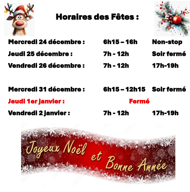 Magasin: 6h15 -12h15 / 15h00 – 19h00
